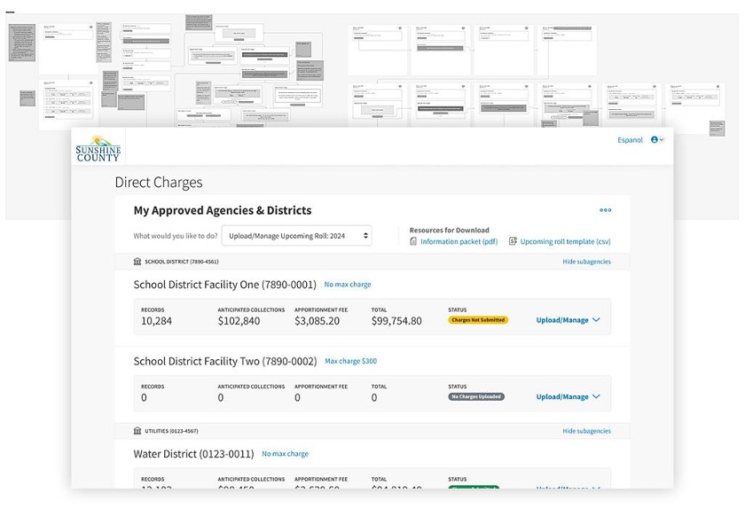 Researching, prototyping, and designing a brand new Taxing Entity Portal, which combines several laborious processes into one sleek portal, saving time, and reducing frustration between our Tax Collector clients and the Taxing Districts they collect taxes for.