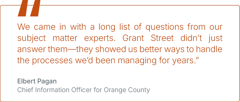 Because TaxSys is a fully hosted, cloud-based solution, infrastructure maintenance and upgrades now happen without manual intervention from county IT. This Grant Street Group-managed environment reduces the county’s operational burden, keeps the system current, and allows Orange County’s technology team to focus on more strategic work rather than maintaining aging servers.